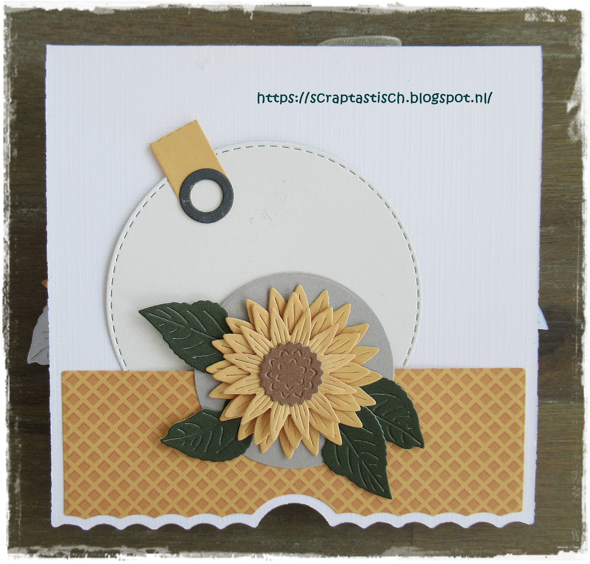 De kleurenkaart deed mij denken aan de zomer en zonnebloemen. De vouwlijn zit aan de bovenkant en heb een deel van de ticket stans van studio light gebruikt en dan krijg je weer een hele andere kaart. Zonnebloemen, de krans en dessinpapier zijn van Marianne design.